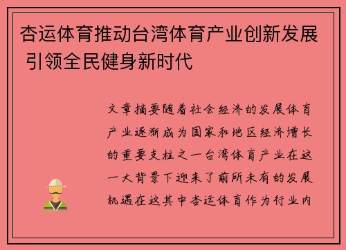 文章摘要:随着社会经济的发展,体育产业逐渐成为国家和地区经济增长的重要支柱之一。台湾体育产业在这一大背景下,迎来了前所未有的发展机遇。在这其中,杏运体育作为行业内的重要力量,凭借创新的商业模式与先进的管理理念,推动了台湾体育产业的革新与繁荣。通过对体育科技的深度整合、全民健身的广泛倡导、体育文化的多元融合以及产业生态链的构建,杏运体育不仅为台湾的体育产业注入了新的活力,还为全民健身事业开辟了新的发展道路。本文将从四个方面详细探讨杏运体育如何推动台湾体育产业的创新发展,并引领全民健身新时代的到来。